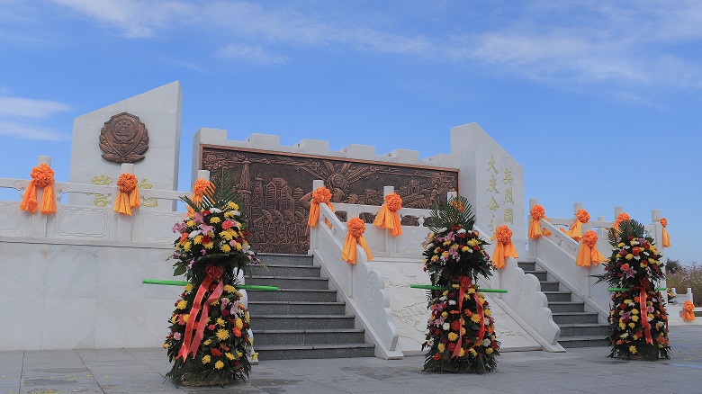 主體形象墻是英烈園的中心建筑,位于墓前廣場與英烈墓地之間,坐北朝南,由臺基、主題浮雕和兩翼劍型墻組成,整體呈中低側高之勢,猶如雄鷹振翅欲飛,寓示大慶公安銘記英雄、繼承遺志、發(fā)揚精神、勇創(chuàng)輝煌之意。兩側的劍型碑象征公安機關打擊違法犯罪和保障人民群眾生命、財產安全的兩把利劍。劍形碑與浮雕墻成15度角,劍尖直指蒼穹,彰顯了大慶公安的氣魄和力度。左側碑上刻有警徽圖案和“警魂”字樣,右側碑上刻有“大慶公安英烈園”的墓園名稱,兩碑的背面分別用中英文刻有大慶公安英烈園的墓志銘。形象墻最高處3.7米,寓意大慶公安成立至今37年。其中,臺基共8級臺階,寓意已犧牲的8名英烈;浮雕墻為長城形狀,寓意人民公安是國家和人民的鋼鐵長城;主題浮雕長9米,寓意英烈精神長久永存;高2.016米,代表2016年建成;浮雕正面由英烈形象、長城、油井等元素構成,彰顯大慶公安英烈舍生忘死、用血肉之軀保家衛(wèi)國的英雄氣概;浮雕背面鐫刻已犧牲英烈的照片、個人自然狀況、英雄事跡及因公犧牲民警姓名,讓人們永遠牢記英雄的名字,銘記他們的感人功績!